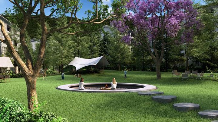 900㎡的疏林草坡作为活动场地,为家庭露营、儿童探索提供了更多体验可能。孩子们在草坡中不受拘束地攀爬奔跑,家长在近处林荫下闲话家常。不远处的蓝花楹围合出下沉式吧台,夜幕四垂点燃篝火,人们在此随意围坐,促膝欢笑。一条水洗石铺设的林中步道时隐时现,如同走进山林画布,诗意与生活在此交融。