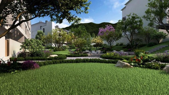 在那山那海,自然不仅是作为风景而存在,回归自然,也不止于欣赏风景,而是要与自然产生亲密的连接。在社区的制高点,面宽充裕的宅间绿地尺度,被打造为绿树成林的森林氧吧,树梢为天,树影为路,还原森山的质感。自然的原石肌理,与骨感枝干相衬,丰富了视觉层次。林中的中庭以深灰色砾石铺底,粗犷的质感有着熨帖的尺度。原石、砾石与植被之间的边界模糊交融,扑面而来野奢庄园的荒野风情,直接拉近了人与自然之间的距离。