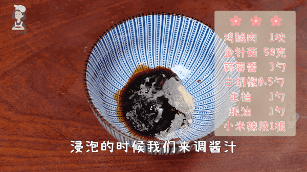 盘底铺一层金针菇,再放上沥干水分的鸡腿肉,最后淋上调好的酱汁。送入微波炉中,加热8-10分钟。