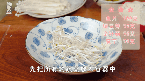 碗中放入豆芽、金针菇、魔芋丝,再加入没过食材的热水。
