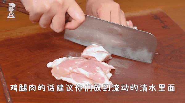 去骨的鸡腿肉切成块,放入流动的清水中冲洗去血水。