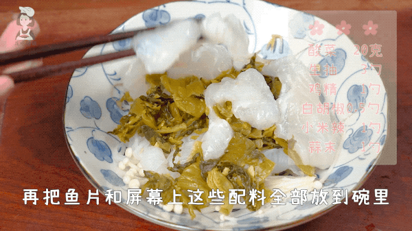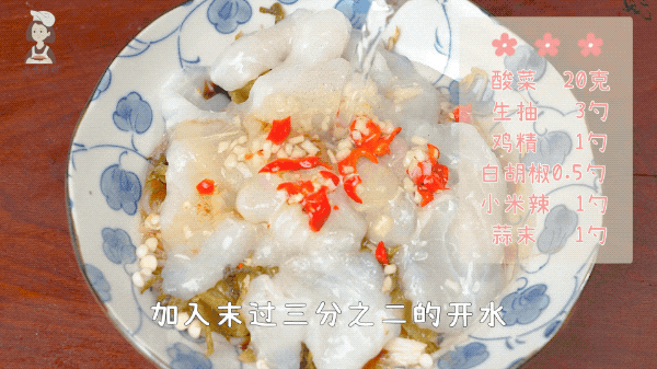 接着把酸菜、巴沙鱼片铺在上面,加入3瓷勺生抽、1瓷勺蒜末、1瓷勺小米椒末、适量白胡椒粉调味。