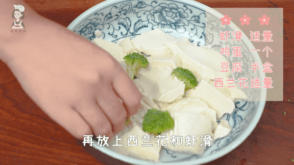 摆上切成小块的西兰花,再掰一点冷冻的虾滑。如果有新鲜的虾仁,可以先加适量盐和白胡椒粉腌制入个底味。