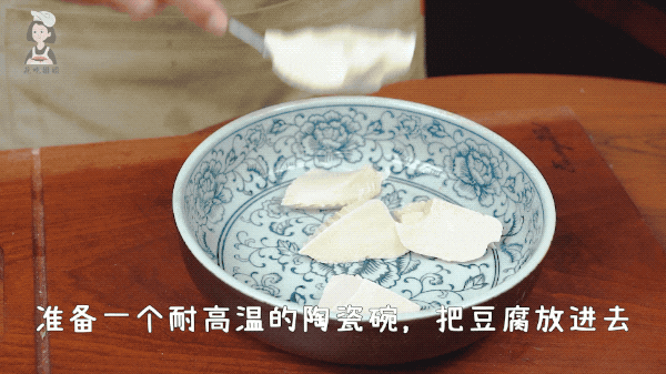 取一口耐高温的碗,把内脂豆腐用勺子挖入碗中。