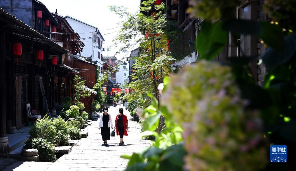 7月25日,游客在陕西省汉中市留坝县城老街上游玩,老街上分布着多家民宿。