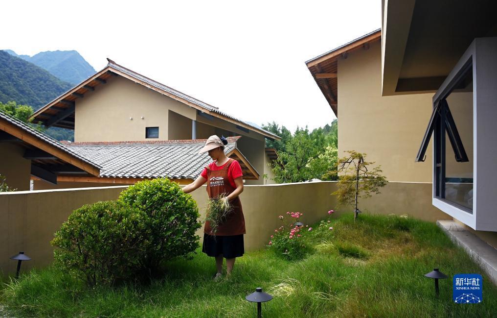 7月24日,陕西省汉中市留坝县玉皇庙镇秦岭1号民宿内的房间管家在清理院内杂草。