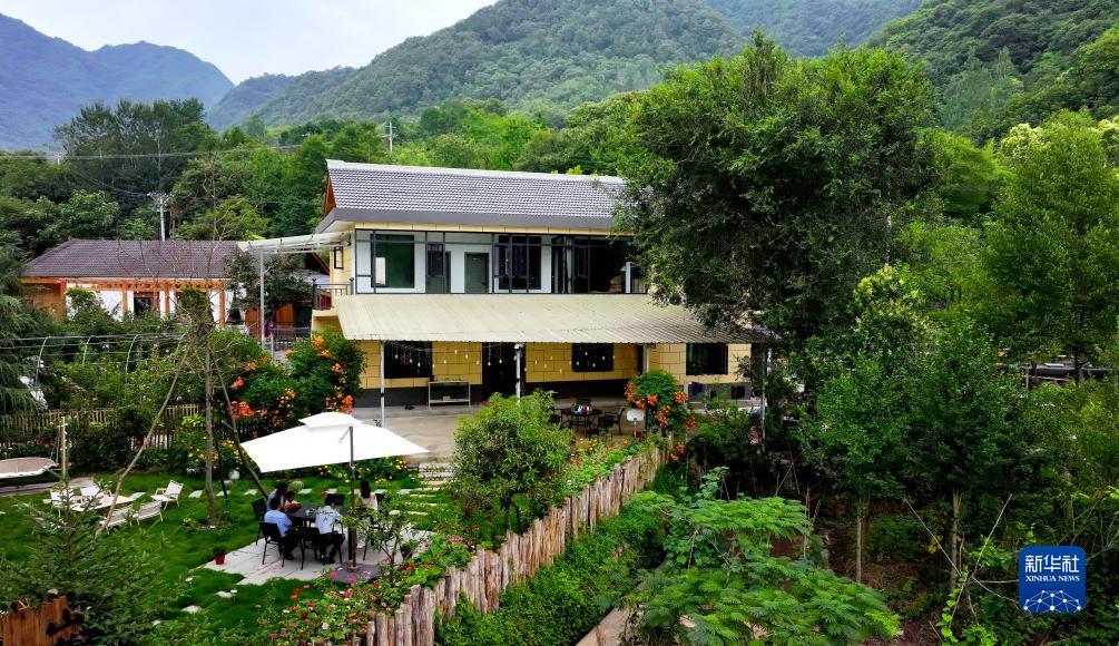 7月24日,陕西省汉中市留坝县火烧店镇秦岭山居民宿内,游客在院内休闲(无人机照片)。
