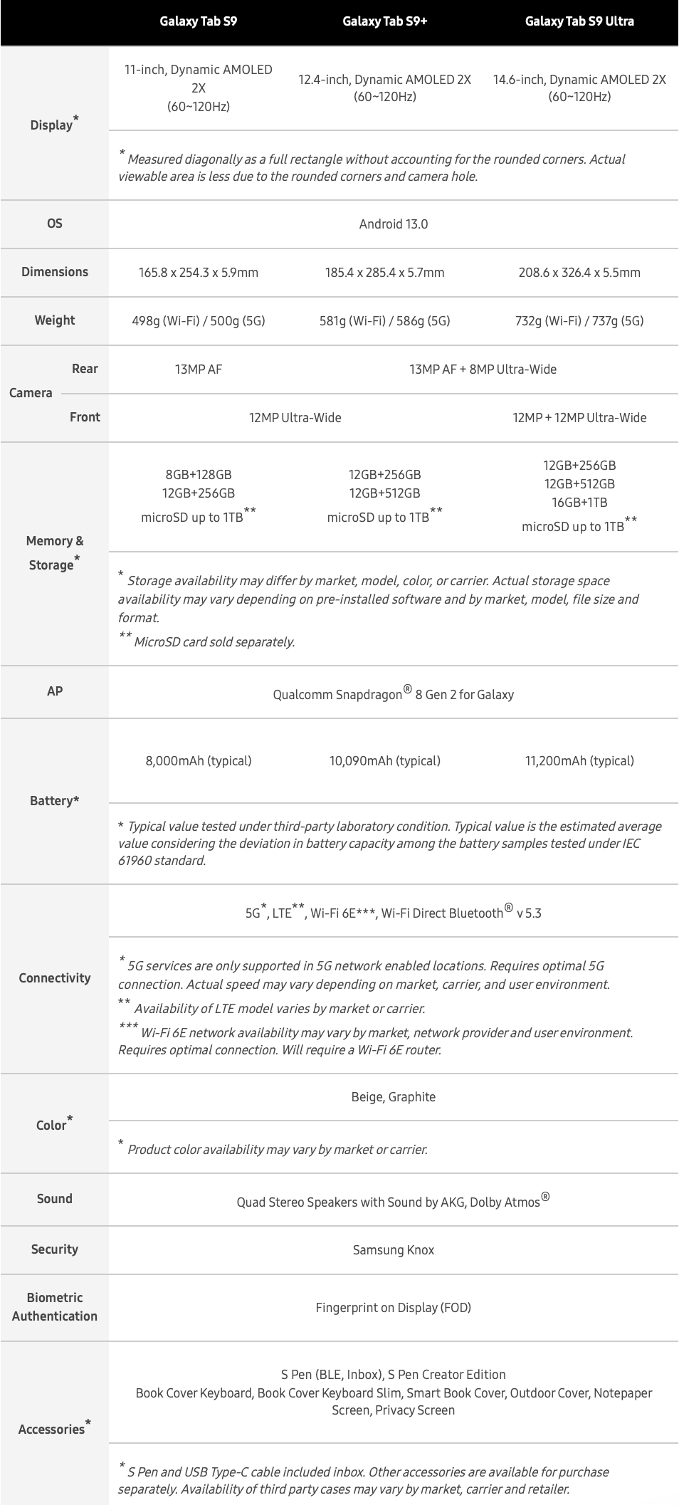 三星还发布三款高端平板电脑:Galaxy Tab S9、Galaxy Tab S9+ 和 Galaxy Tab S9 Ultra,均配备高通骁龙 8 Gen 2 For Galaxy 处理器。