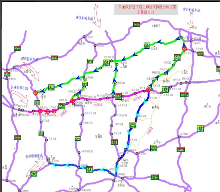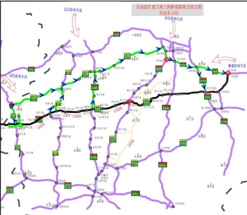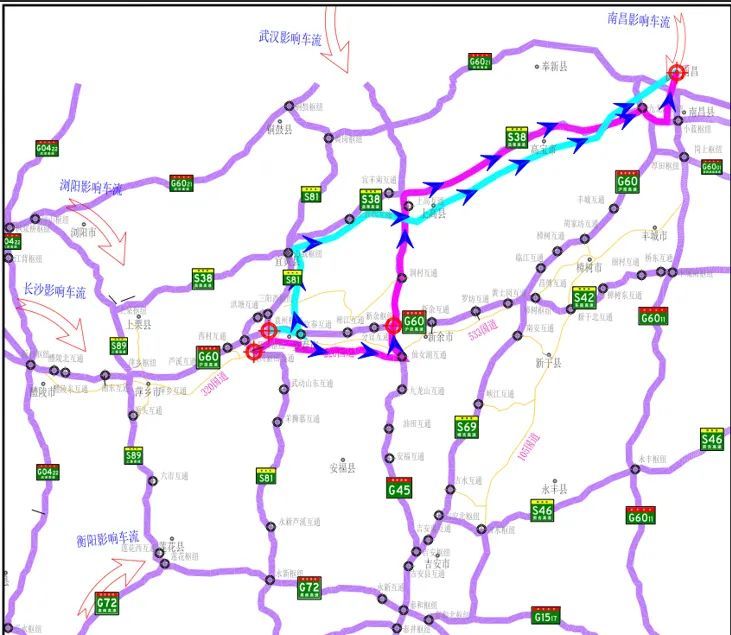 东往西交通管制点:樟树枢纽、厚田枢纽、东乡枢纽、新余枢纽、新田枢纽、岗上枢纽。
