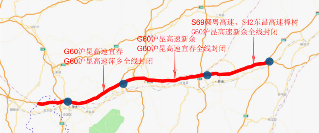 涉及封闭收费站:黄土岗收费站、罗坊收费站、新余收费站、分宜收费站、彬江收费站、宜春收费站、西村收费站、芦溪收费站、萍乡收费站。