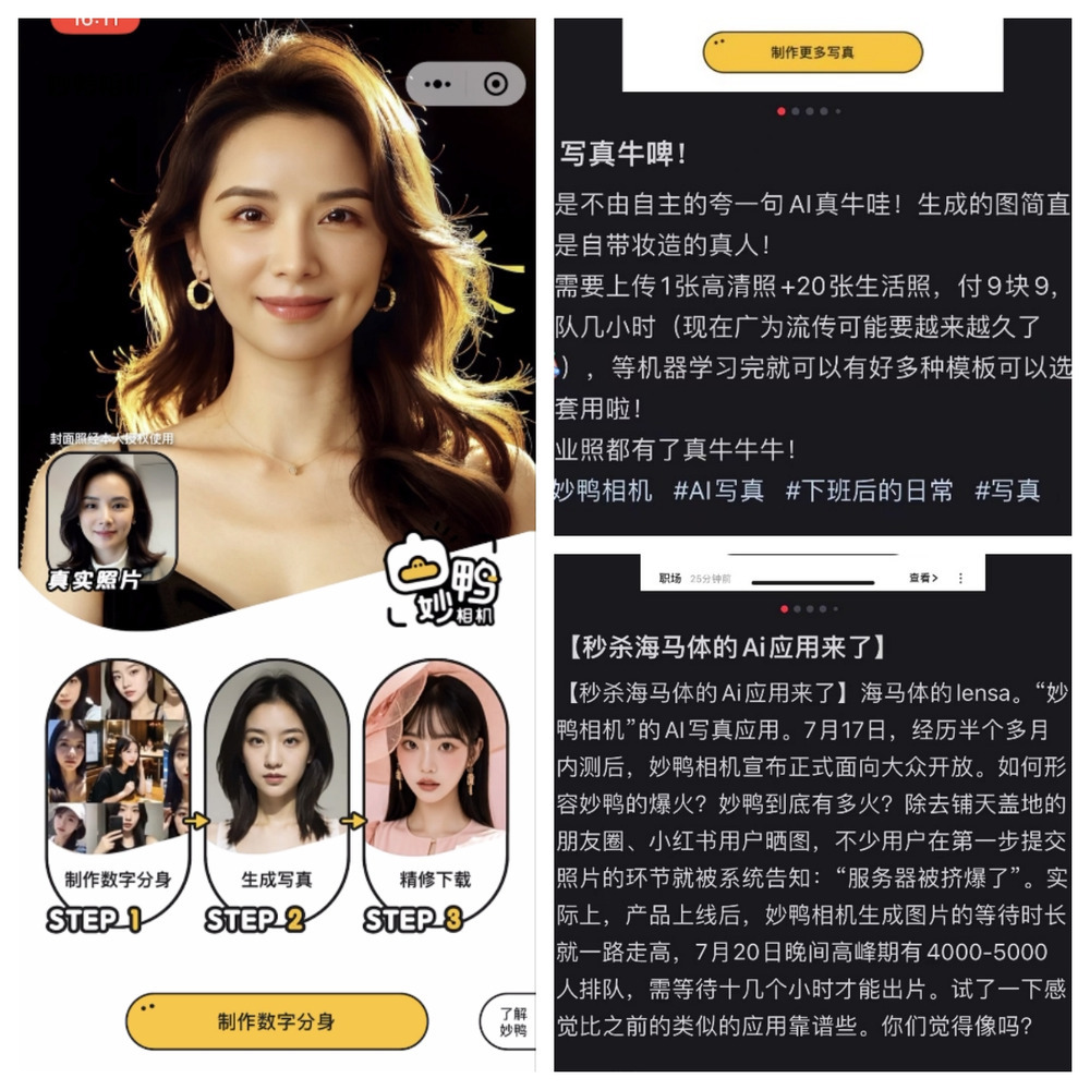 DoNews7月26日消息,最近一款 AI 拍照小程序“妙鸭相机”推出后红极一时,付费 9.9 元,即可获得号称“爆杀海马体、天真蓝”的体验。