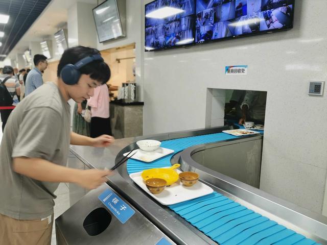 采访中,记者在食堂的餐具回收处看到,学生用餐完毕后,会把筷子、勺子等按类别投放到回收桶,干湿垃圾严格分类。一旁正在滚动着的蓝色传送带上,餐盘基本个个都是“光盘”。