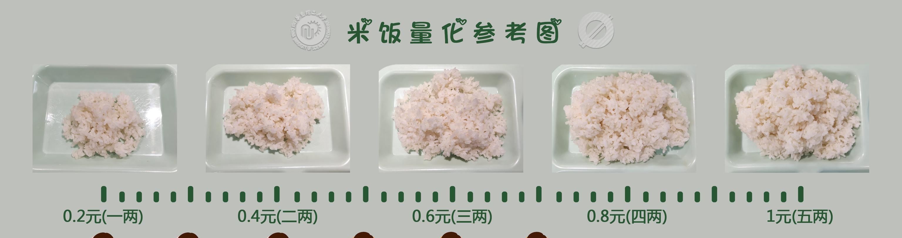 在华东理工徐汇校区一食堂,每个窗口的电子屏上,都清晰罗列着菜名,以及全份和半份的价格。在主食区,最醒目的位置留给了一块展板:不同分量的米饭,对应不同的量化参考图。一两米饭售价0.2元、二两0.4元,师生可以根据自己的饭量自选。