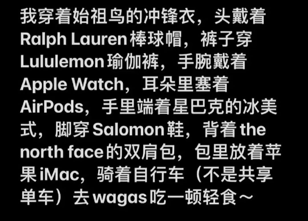 有人表示,穿着始祖鸟的冲锋衣,头戴着Ralph Lauren棒球帽,裤子穿Lululemon瑜伽裤,脚穿萨洛蒙鞋,背着北面的双肩包,这才是全套中产装备。