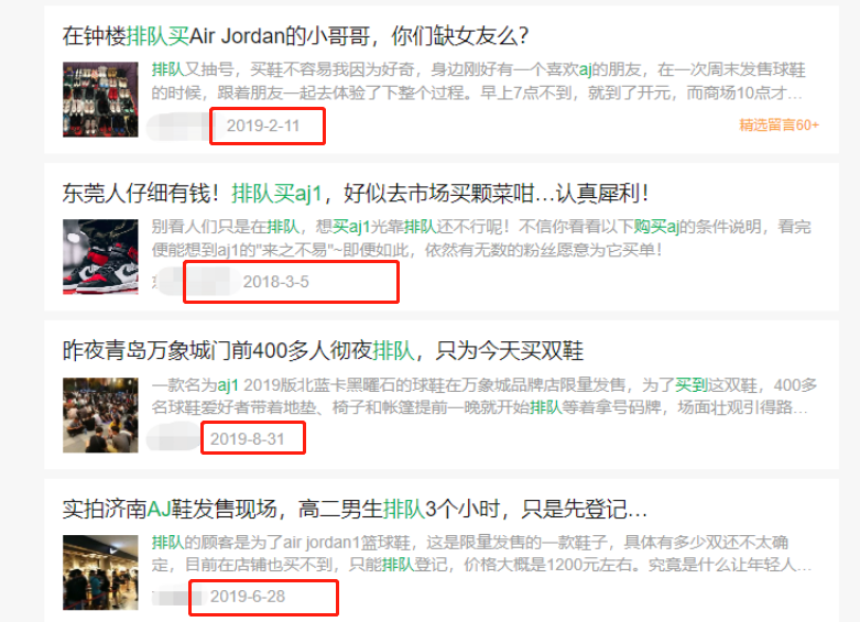 搜索排队买AJ,出现的文章像是在考古,时间大多是三四年前的。