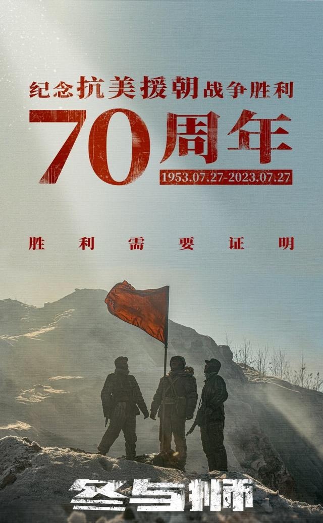 “胜利需要证明”,《冬与狮》发布的纪念日海报上,这六个红字醒目居中,力透天空,昭示着70年前抗美援朝战争的伟大胜利。经历血战的战场,硝烟渐散。光线透过薄雾洒在阵地上,照亮一层白雪,宁静而肃穆。象征胜利的红旗插在阵地上,迎风飘扬,猎猎作响。三名浴血奋战的志愿军战士目光坚定,仰望红旗,用血肉身躯和钢铁意志赢得了胜利,挺立起中华民族和中国军人的脊梁。