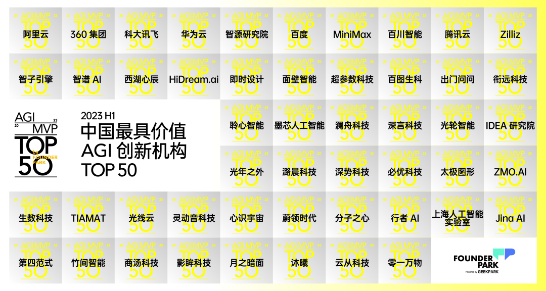 因此,Founder Park 评选了 2023 H1「中国最具价值 AGI 创新机构 TOP 50」(AGI MVP TOP 50),联合行业知名专家、机构,从中国大模型生态创新视角切入,涵盖基础设施、模型工具链、大模型、开发工具链、应用范式等多个维度,筛选出 2023 年上半年在技术、商业和行业影响方面表现颇具亮点的创新机构。