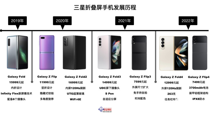 PChome统计,自2021年开始,三星的Galaxy Fold和Galaxy Z Flip开始稳定于下半年更新。此外,纵向对比也可以发现,三星折叠屏手机的进化脉络其实异常清晰,那就是提高易用性的同时,价格持续下探。