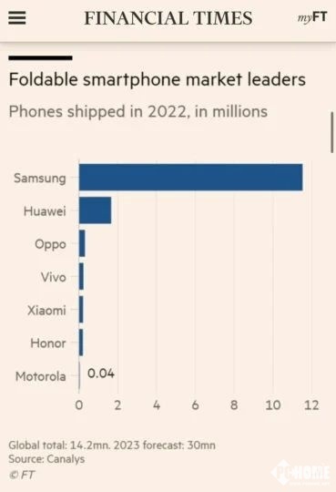 在此背景下,三星已经捷足先登,Canalys调研数据数据,2022年,全球可折叠手机出货量为1420万台,其中三星出货量接近1200万台,占比84.51%。