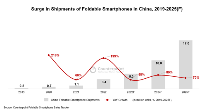 这还仅仅是起点,Counterpoint Research披露的调研报告显示,预估2019年-2025年,全球可折叠智能手机出货量将以114%的复合年增长率增长。