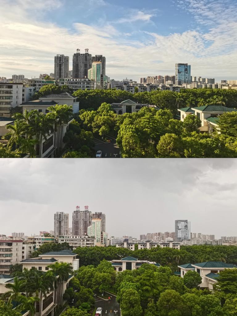 拼版照片:记者27日上午、下午在潮州市同一地点拍摄的对比图。新华社记者 詹奕嘉 摄