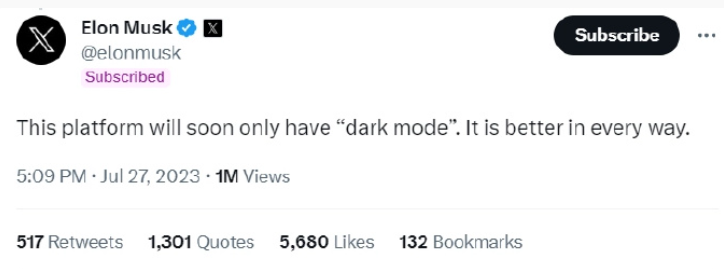 马斯克在 Twitter 发文宣布,该平台很快将只有“暗黑”模式,它在各个方面都更好。目前该平台提供浅色和深色(夜间)模式,深色模式下有“暗淡”和“暗黑”两种模式可选。“暗淡”模式虽然也是黑色的,但背景会变成深蓝色而不是全黑,改动后暗黑模式将成为默认且唯一可用的主题。