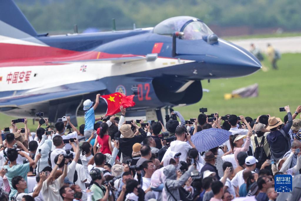 7月27日,在空军航空开放活动·长春航空展首个公众日,观众高举国旗与飞行员互动。