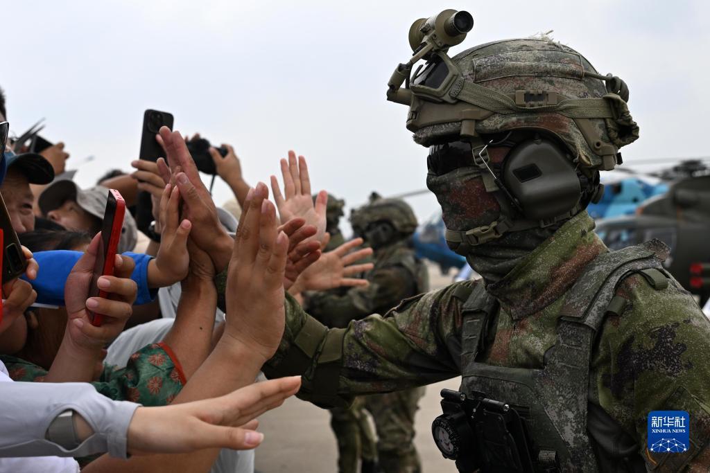 7月27日,在空军航空开放活动·长春航空展首个公众日,空降兵与观众进行互动。