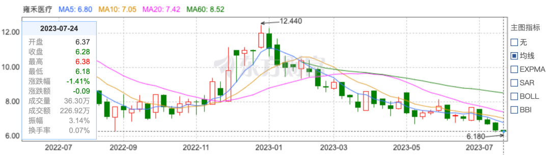 随着广告营销撑起的营收泡沫破灭,雍禾医疗的股价也一路下跌。其股价从2023年初的11.94元/股,一路下跌,相较于发行初期的股价,雍禾医疗市值缩水超一半。