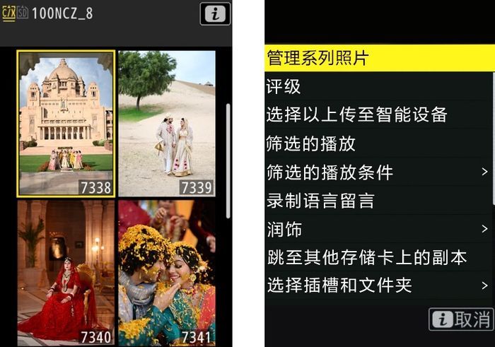尼康Z 8还支持竖直播放和查看包括缩略图在内的拍摄内容,从而使竖拍更加舒适。播放时的“i”菜单也以竖直显示,这个功能让你可以随时访问设置而无需更改为横向,对于拍摄婚礼的摄影师来说格外体贴。轻松、愉悦地完成每一次对新人的祝福,让爱在毫无防备降临时也能够从容地捕捉。