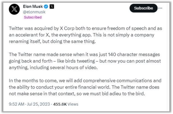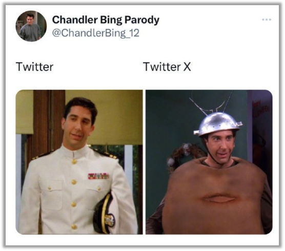 Siegel & Gale的品牌传播总监史蒂夫·苏西表示:“推特花了15年多的时间才在全球范围内获得这么高的知名度,因此失去推特这个品牌对财务来说是一个重大打击。”