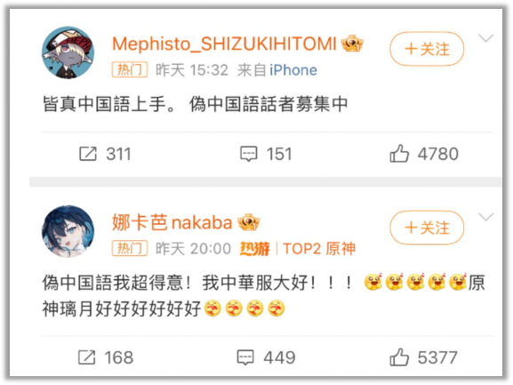 画师们在微博上和国内网友们用伪中国语激情互动。