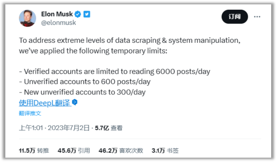今年7月,他又说要限制推特的阅读量,以防止AI公司大量抓取推特数据对真实用户体验造成影响。