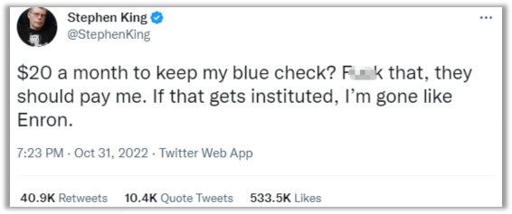 结果被美国知名作家斯蒂芬·金回怼说 “要每个月支付20美元才能保留我的蓝V认证吗?他们应该付钱给我。”