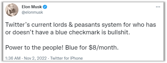 一开始他准备对所有推特蓝V认证用户收取每月约20美元的费用。