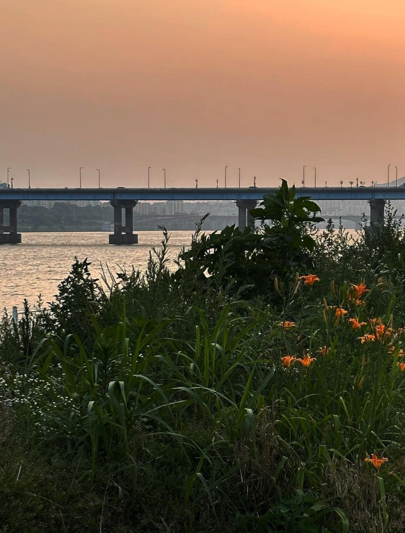 而圣水洞再往远走就是纛島汉江公园,这个汉江公园并没有汝矣岛汉江公园那么出名,但是这里的景色超美,在这里可以点一个炸鸡坐在江边的草坪上看看日落真的很享受!