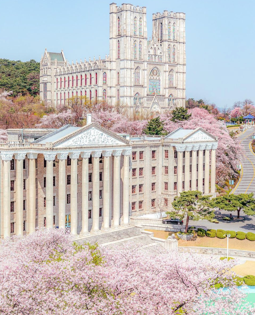 而庆熙大在影视剧里的高出镜率,也让这座美丽校园成为了韩国旅游必去的打卡景点之一。每年4月就到了韩国的樱花季,而在韩国赏樱最美的地点就是庆熙大学了。樱花在校园里漫山遍野,美得像是一幅油画。