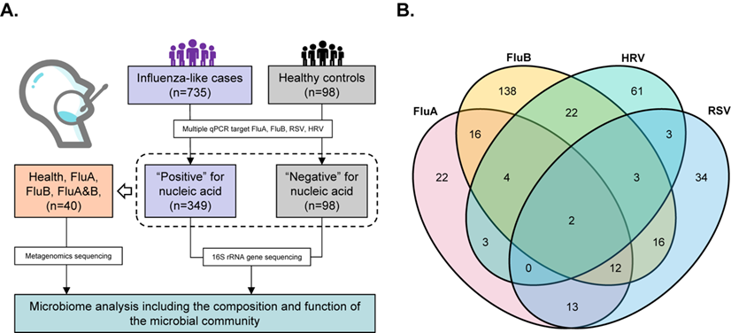 本研究中,研究团队招募了包含735名上呼吸道症状的门诊患者,使用多重RT-PCR确定了349名参与者的感染性病毒类型,并使用16S rRNA基因和宏基因组测序分析了他们的上呼吸道微生物组。结果发现,甲型流感病毒(FluA)、乙型流感病毒(FluB)、呼吸道合胞病毒(RSV)和人鼻病毒(HRV)感染形成的口咽菌群表现出三种不同的生态失调模式,Veillonella在所有呼吸道病毒感染组均显著富集。研究团队进一步基于GRiD算法预测呼吸道病毒感染下共生细菌和病原菌的生长速率。结果发现,流感病毒感染后,呼吸道病原菌的预测生长速度增加,而共生菌如婴儿链球菌(Streptococcus infantis)和缓症链球菌(Streptococcus mitis),可能对这些病原菌的过度生长起到定植抗性作用。这些发现对于阐明健康参与者和急性呼吸道病毒感染的呼吸道微生物群的差异和动态至关重要,有助于阐明病毒-宿主-细菌相互作用的发病机制,为未来有效预防和治疗呼吸道感染的研究提供见解。