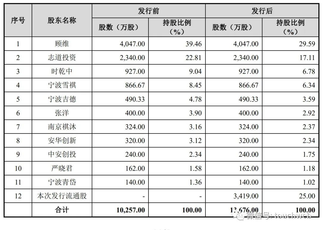 IPO后,顾维持股为29.59%,志道投资持股为17.11%,时乾中持股为6.78%,宁波雪祺持股为6.34%,宁波吉德持股为3.59%;