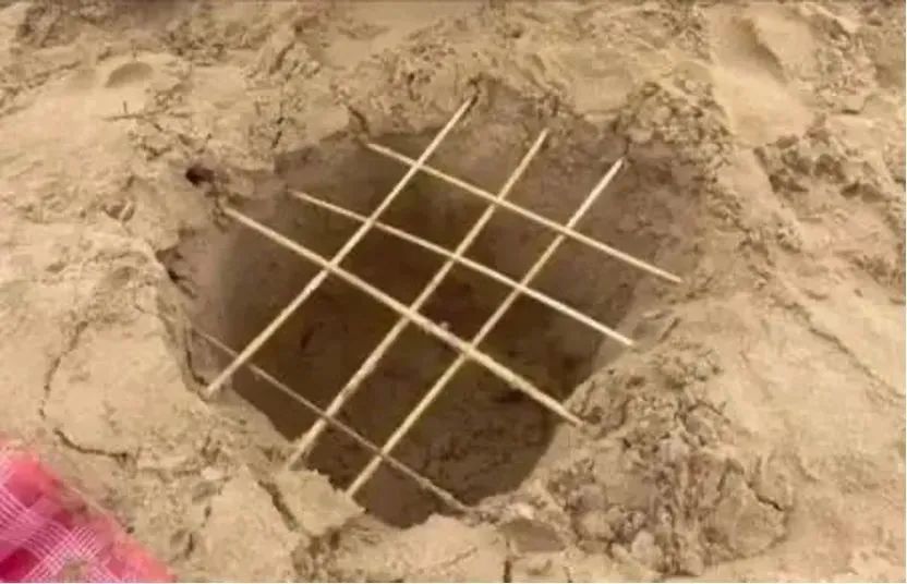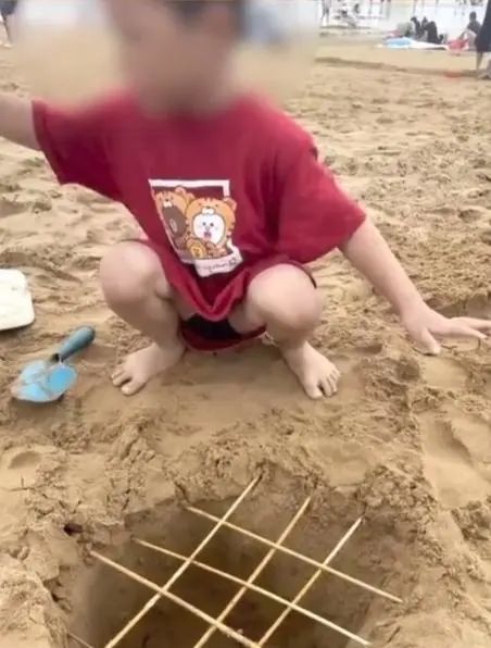 近日,山东青岛一母亲晒出孩子在金沙滩用竹签制作陷阱的照片,并配文称“孩子的恶作剧,谁会踩到?”