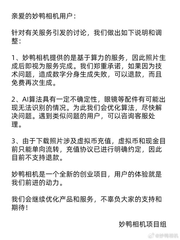 同日,妙鸭相机官方微博回应称,由于下载照片涉及虚拟币充值,虚拟币和现金目前只能单向流转,充值协议已进行明确约定,因此目前不支持退款。“如果因为技术问题造成数字分身生成失败,可以退款,而且免费再次生成。”