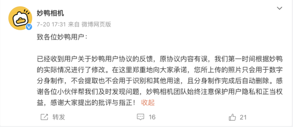 对此,妙鸭相机在7月20日回应称,原协议内容有误,并第一时间删除了相关条款。尽管妙鸭相机迅速道歉,但依然有用户对其数据安全存在质疑。