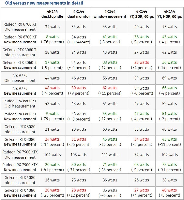 除了Radeon RX 6800/6700 XT和RX 7900 XT以外,还使用了英伟达GeForce RTX 3060 Ti、RTX3080和RTX 4080以及英特尔锐炫A770作为对比。测试中使用了4K@144Hz的显示器,分别比较了闲置功耗、双显示器的功耗、窗口移动、60FPS的SDR YouTube和60FPS的HDR YouTube视频播放。