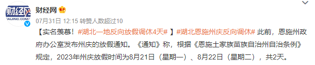 家人们谁懂啊!?原本的恩施州庆,是8.19~8.20,也就是周六周日两天,经过这波操作,反而把假期调整到了周一、周二,加上正常周末,直接连休4天!