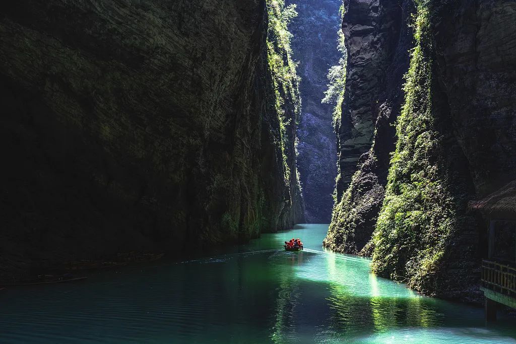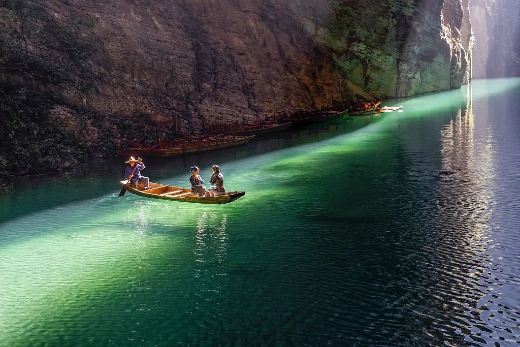 乘船沿着河流前行,两岸山谷地缝不断,移步换景,不到20公里的旅途,将自然的险、奇、秀融为一体,下有河涧清流,舟行水上如悬浮无物,上有罡步天梯,触手可摘星,“中国仙本那”的美誉也由此而来~