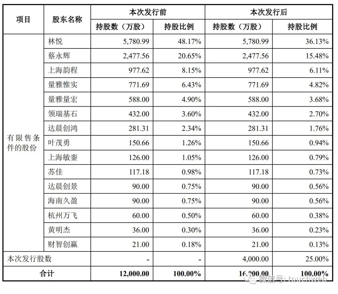IPO后,林悦持股36.13%,蔡永辉持股为15.48%,上海韵程持股为6.11%,量雅惟实持股为4.82%,量雅量宏持股为3.68%,领瑞基石持股为2.7%,达晨创鸿持股为1.76%,叶茂勇持股为0.94%,上海敏銮持股0.79%,苏佳持股为0.73%,达晨创景、海南久盈分别持股为0.56%,杭州万飞持股0.38%,黄明杰持股0.23%,财智创赢持股为0.13%。