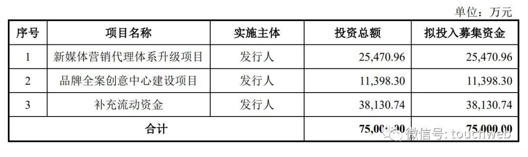 悦普集团计划募资7.5亿,其中,2.55用于新媒体营销代理体系升级项目,1.14亿用于品牌全案创意中心建设项目,3.81亿元用于补充流动资金。