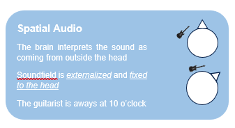 ii) 支持我们将声音外化,并为听众创造沉浸式声景。这使我们解决了传统头戴式耳机、头戴式配麦耳机和耳塞式耳机的一个基本问题,声场随您一起移动,而当我们收听外部扬声器或与周围现实世界互动时,就不会发生这种情况。
