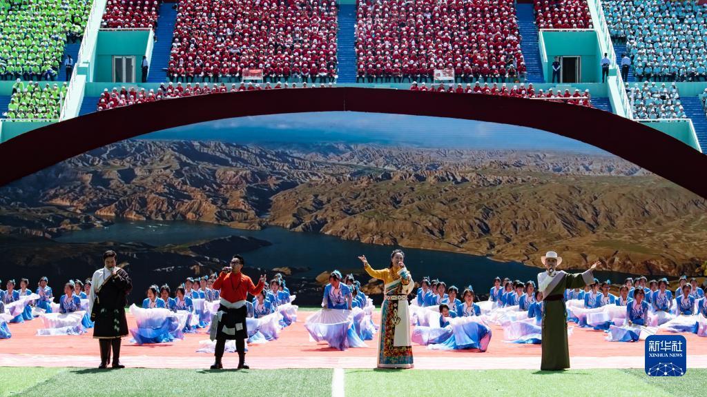 8月1日,当地群众在海南藏族自治州成立70周年庆祝大会上表演节目。