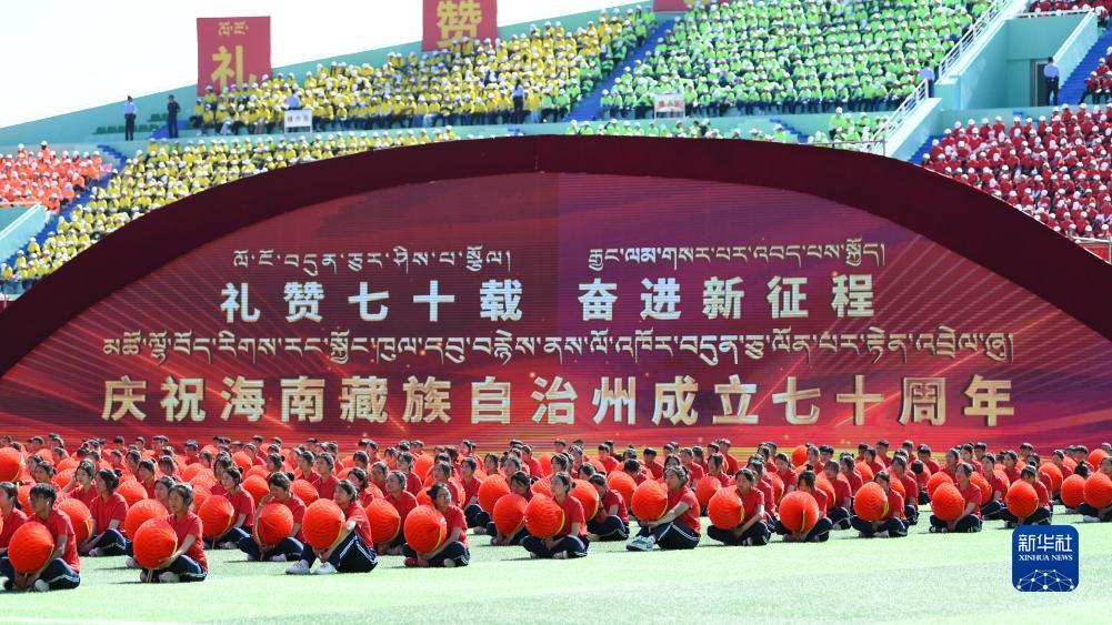 当日,青海省海南藏族自治州举行庆祝成立70周年大会。海南州民族体育场彩旗飘飘,歌声悠扬,各族群众身着盛装,满怀喜悦。